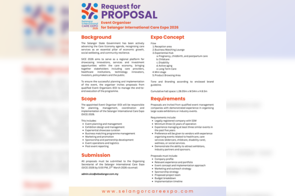 The Selangor State Government is advancing the Care Economy as a key driver of economic growth, social wellbeing, and community resilience. SICE 2026 will serve as a regional platform to showcase innovations, services, and investment opportunities, bringing together key stakeholders such as care providers, healthcare institutions, technology innovators, investors, policymakers, and the public. To ensure its successful execution, proposals are invited from qualified Event Organisers (EO) to manage the programme end-to-end.